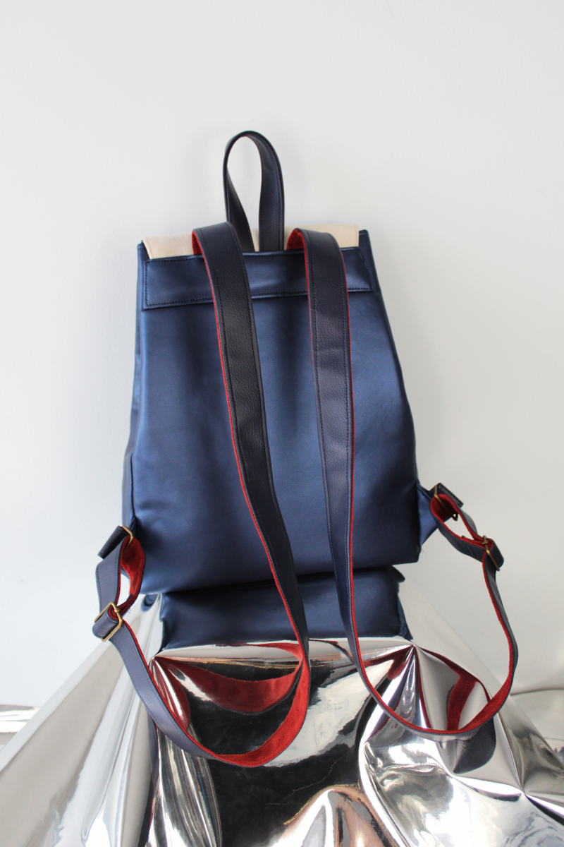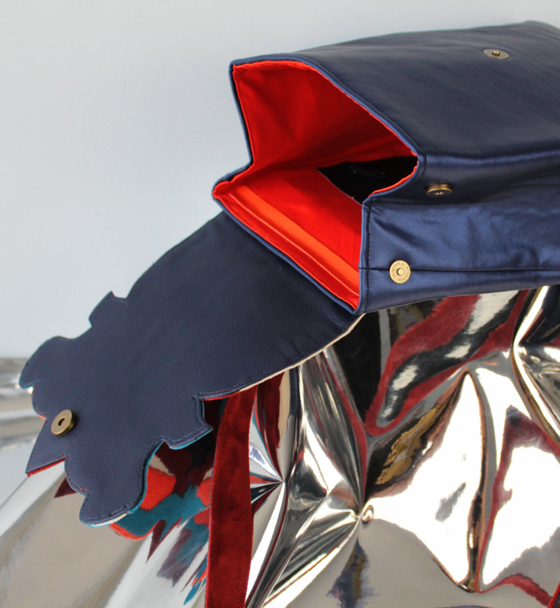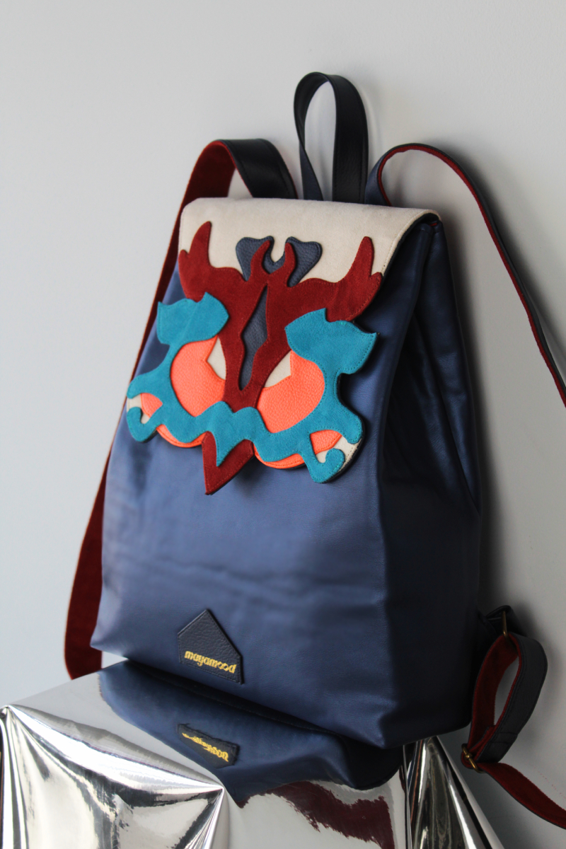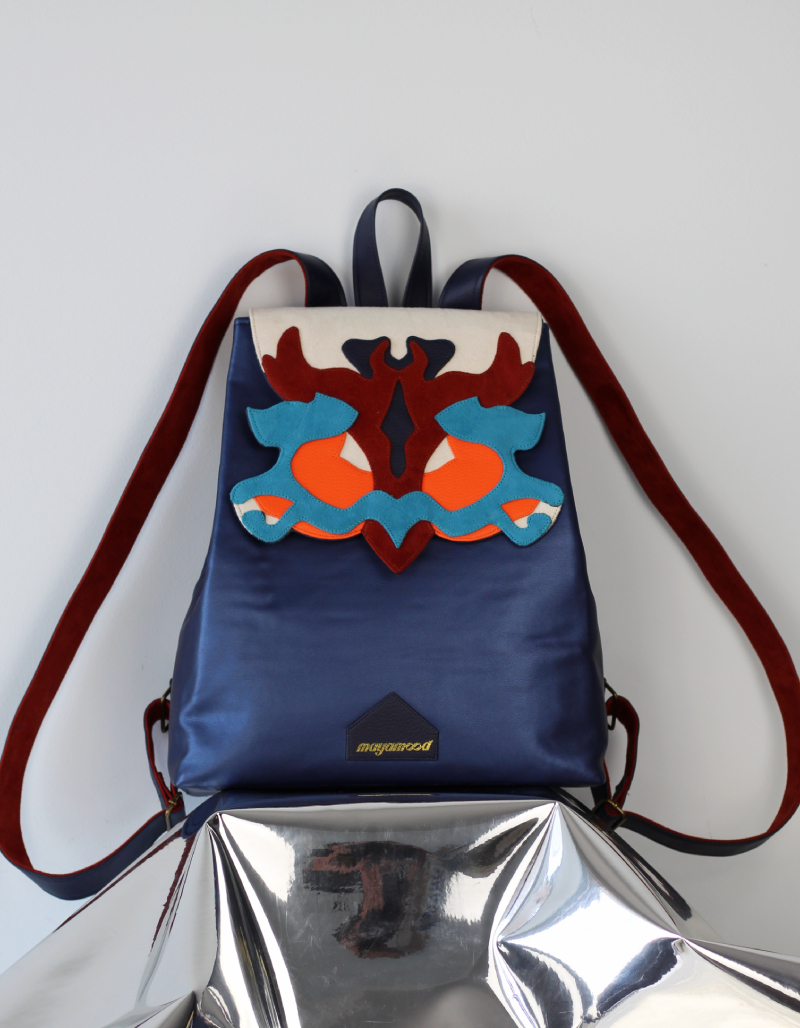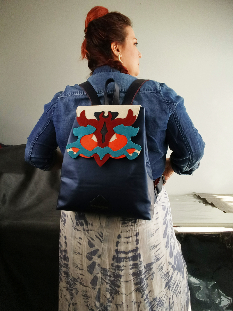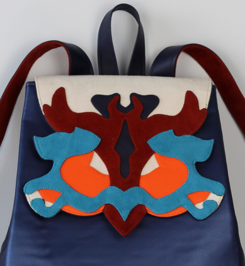 Női hátizsák, melynek nonfiguratív, formára vágott fedele különböző színű és felületű műbőrből, rétegezés technikával készült. A táska mérete 34*28*8 cm, felül 22cm széles, felül két, elöl egy mágneszárral zárható. Kétszínű vállpántjai 52-88 cm-ig állíthatóak, belül egy cipzáros és egy nyitott mobilzsebbel.